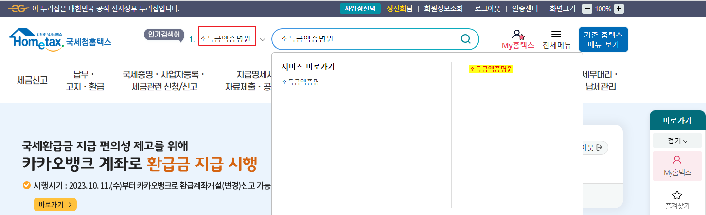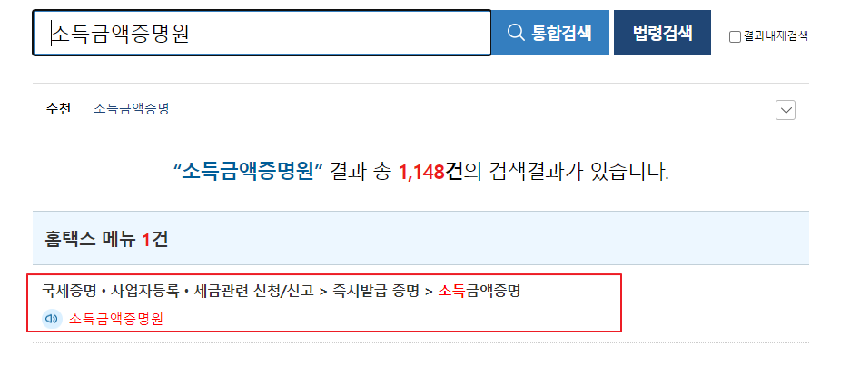홈택스 홈페이지에서 검색창에 소득금액증명원을 검색하세요.