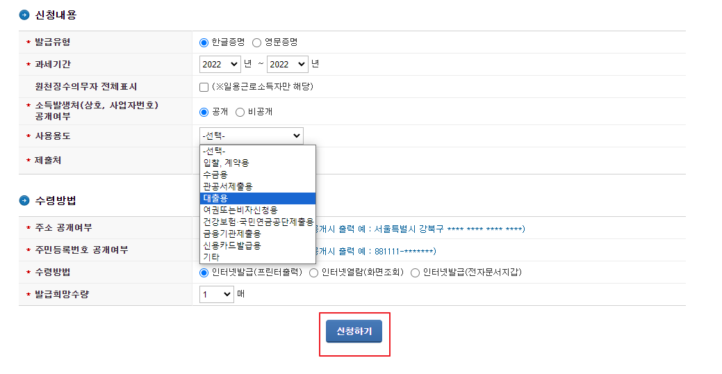사용용도와 제출처를 선택 후 신청하기를 클릭합니다..