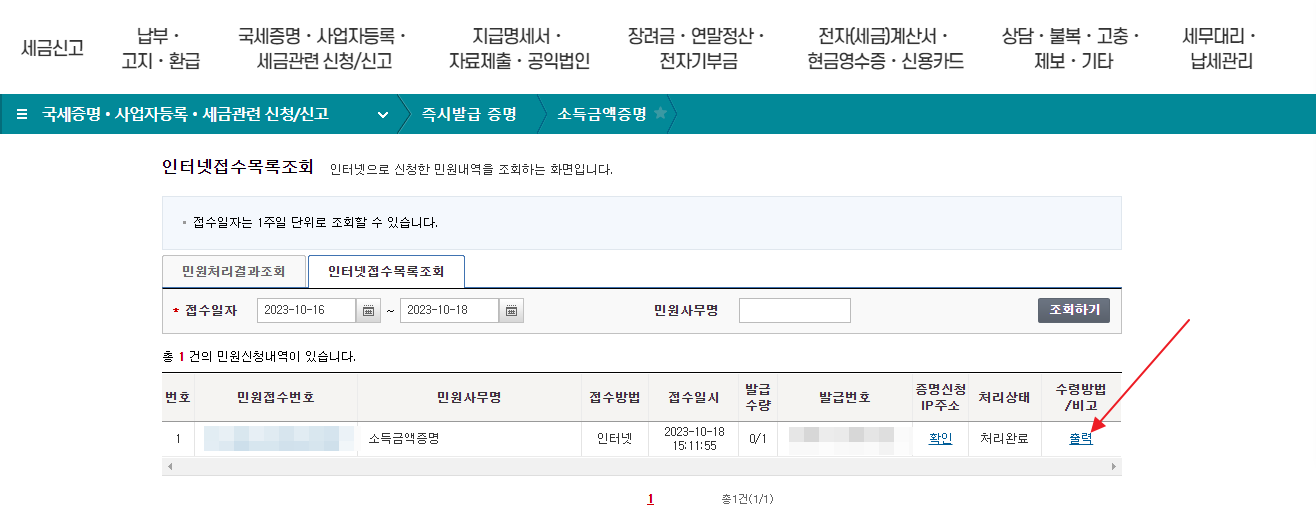 최종 확인을 누르면 인터넷 접수목록조회 창이 열리고 바로 처리완료를 확인할 수 있습니다.