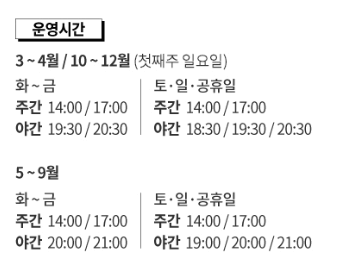 화~일요일, 공휴일 : 20시30분 공연 (매주 월요일은 시설물 점검으로 휴무)