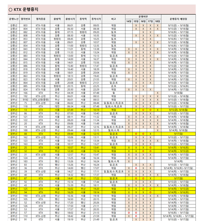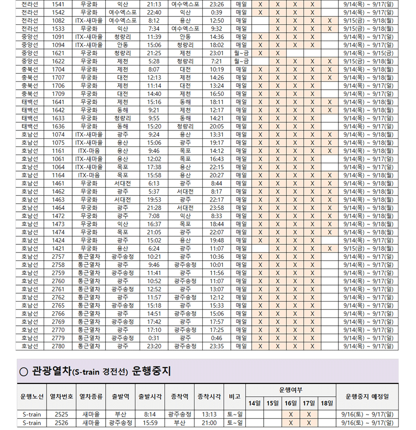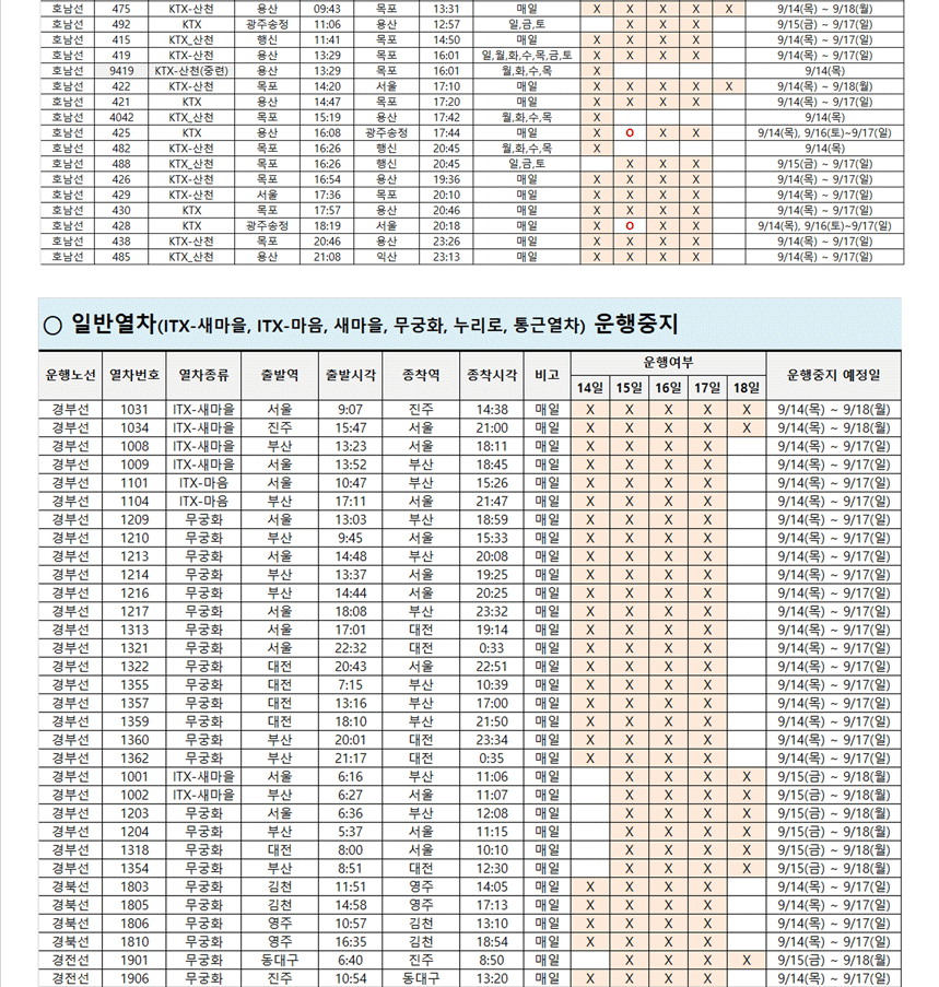 파업으로 취소되었다가 9/17일(일) 운행 재개하는 열차는 아래와 같습니다.
