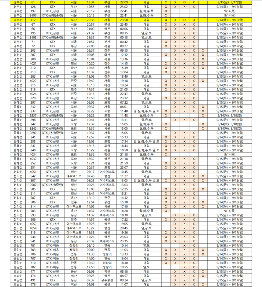 | 부산(12:30) - 서울(15:14) | KTX 32 | 울산, 신경주, 동대구, 대전, 오송, 광명 |