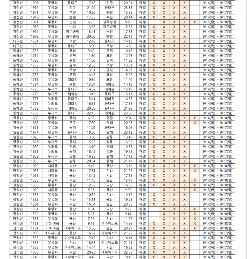 열차별 운행노선, 열차번호, 출발역, 출발시간, 도착역, 도착시간, 운행 중지일정 등이 상세히 안내되어 있습니다. 사전에 미리 체크하시어 이용에 불편이 없도록 아래의 열차 운행 일정 미리 체크하시기 바랍니다. 운행중지로 인한 열차 승차권은 영업일기준 7일 이내에 자동 반환됩니다. 또한 파업으로 인해 환불 취소한 경우는 위약금이 발생되지 않습니다.